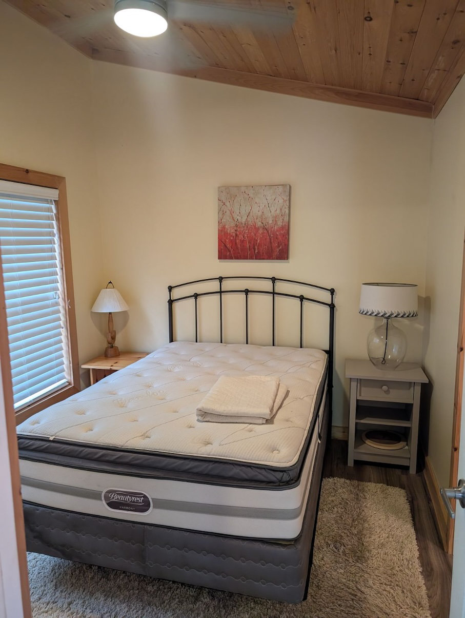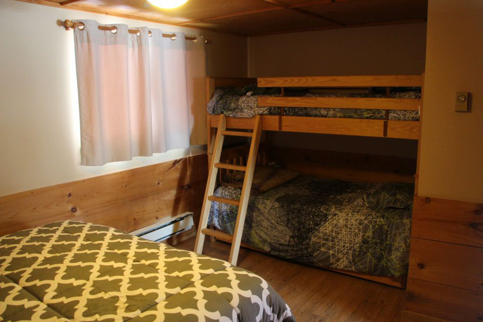 Cottage #4Large, family friendly two bedroom cottage. Modern kitchen with new appliances, including a dishwasher. Updated 3 pc. bathroom. Walk out from kitchen to huge, 2 level deck with patio furniture and Weber BBQ. Living room has a 5 person sectional couch and large TV. 2 Queen Beds + 1 Twin Bunk Bed for a maximum capacity of 6. Winterized, including a gas fireplace & electric heat for the colder months.